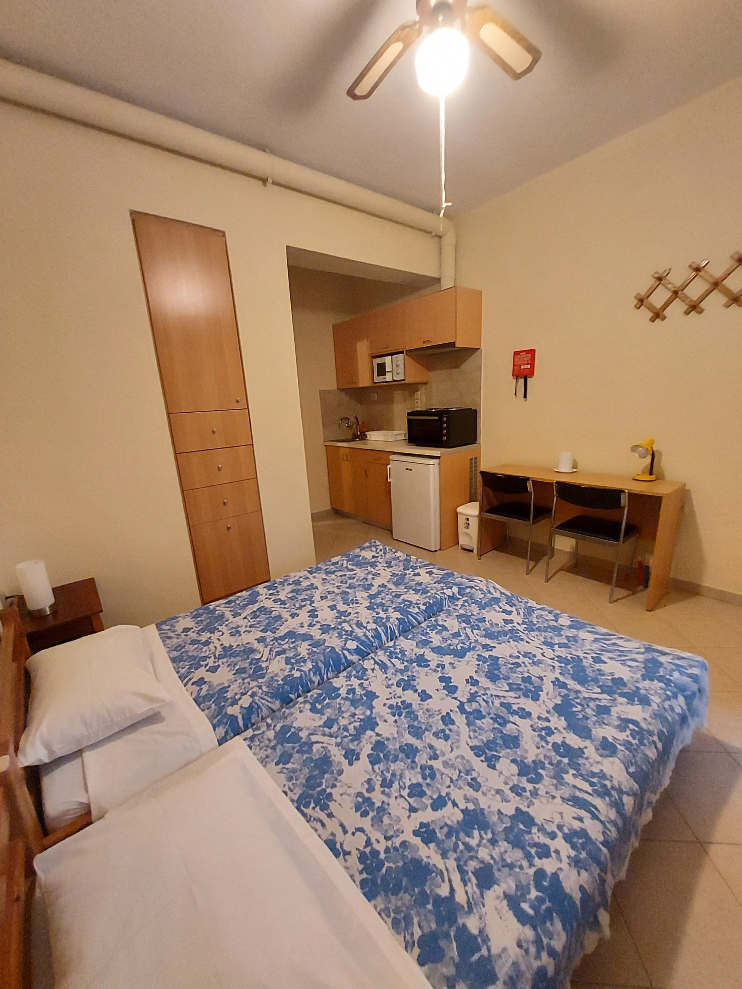 Set on a tranquil, pine-covered hillside overlooking the shimmering Aegean Sea, our efficiency rooms offer a peaceful and practical retreat designed for comfort and simplicity. Each space is thoughtfully arranged to accommodate your needs, featuring a cozy bedroom with either a single or double bed available upon request.